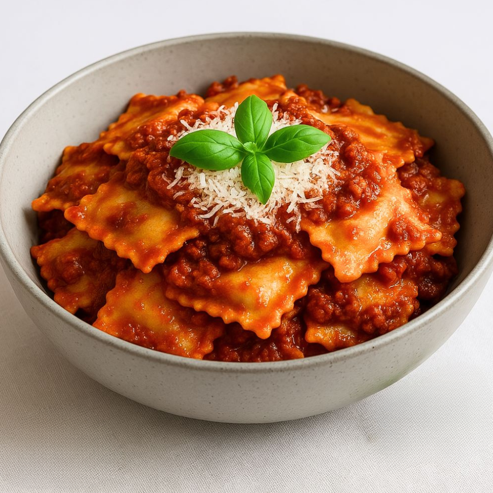 Beef ravioli (pasta: wheat flour, egg, water; filling: beef, breadcrumbs [wheat flour, yeast], parmesan cheese [milk], onion, garlic, herbs), Bolognese sauce (chopped tomatoes, tomato purée, onion, garlic, olive oil, oregano, basil, salt, black pepper).