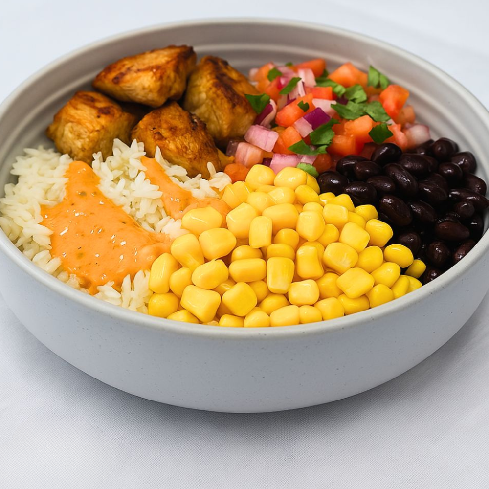 Grilled chicken breast, cooked brown rice, black beans, sweetcorn, red bell pepper, red onion, tomato salsa (tomatoes, onion, lime juice, coriander), cheddar cheese (milk), sour cream (milk), olive oil, cumin, paprika, salt, black pepper.