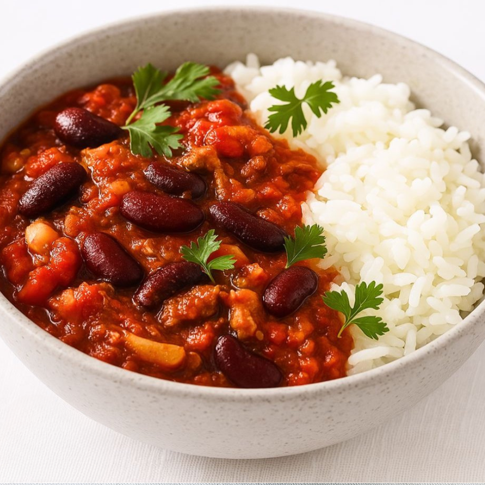 Cooked white rice, minced beef, red kidney beans, chopped tomatoes, tomato purée, onion, red capsicum, garlic, olive oil, cumin, paprika, chilli powder, oregano, salt, black pepper.